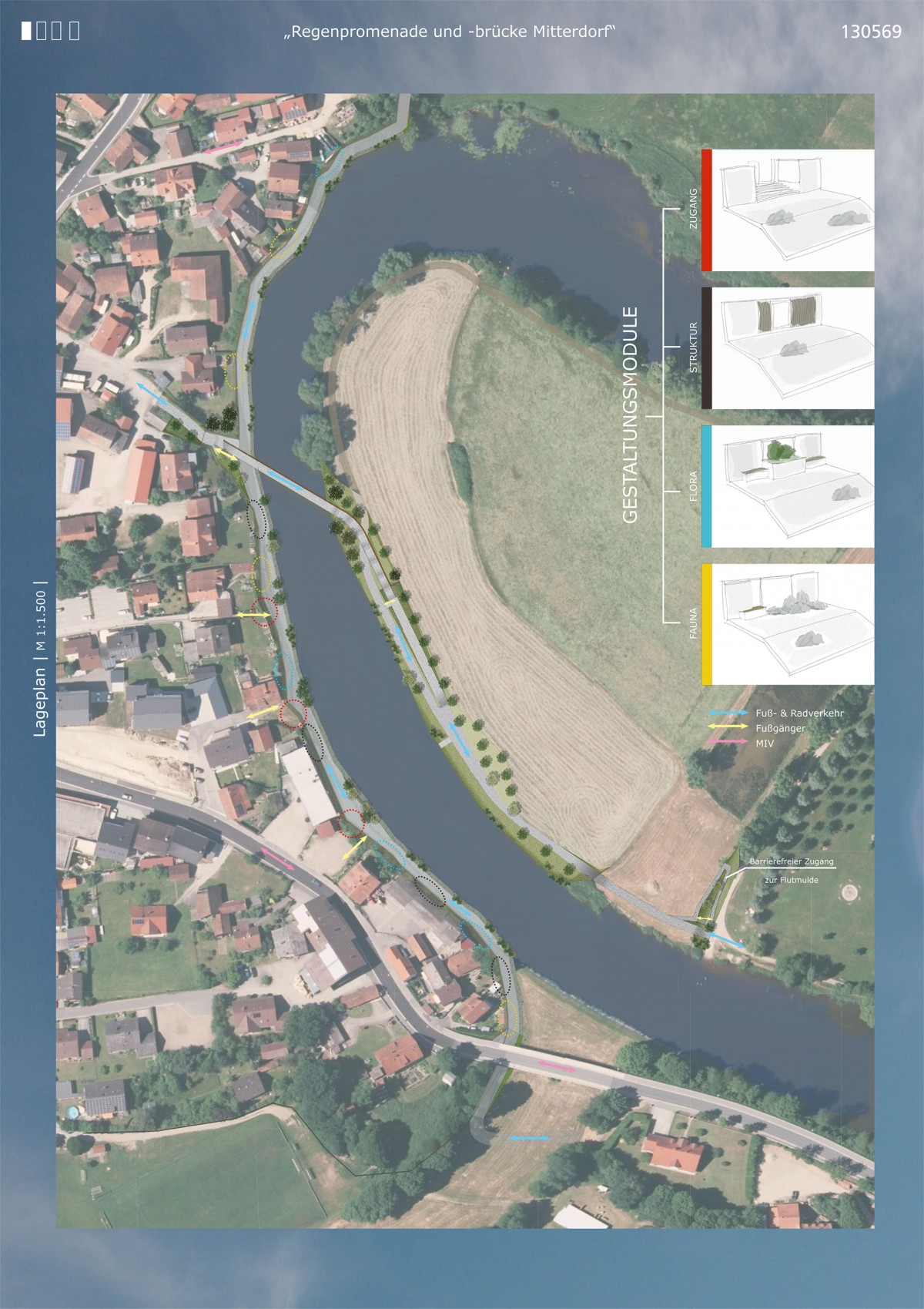Auf Mitterdorfer Seite ist das dominierende Element sicherlich der nötige Hochwasserschutz. Die dadurch beengten Platzverhältnisse sollen soweit es möglich ist mit Bepflanzung und den Modulen aufgelockert werden. Rechtsufrig hingegen findet sich eine weitläufige Naturlandschaft welche durch den Eingriff eines Brückenbauwerks so gering wie möglich gestört werden soll. Daher wird ein Großteil der Rampe auf einen Damm errichtet, dieser zur offenen Landschaft hin sanft abfallende Damm fügt sich wunderbar in das vorherrschende Landschaftsbild ein. Auch die mit dem Anstieg der Rampe begleitende und sich verdichtende Bepflanzung führt weiters zu einem harmonischen Übergang mit der Bestandsvegetation. Am Rampenfuß lädt eine Weitung des Weges zum Ruhen und Verweilen ein und bildet das Verbindungsstück von Hochwasserschutz und der angrenzenden Naturlandschaft.