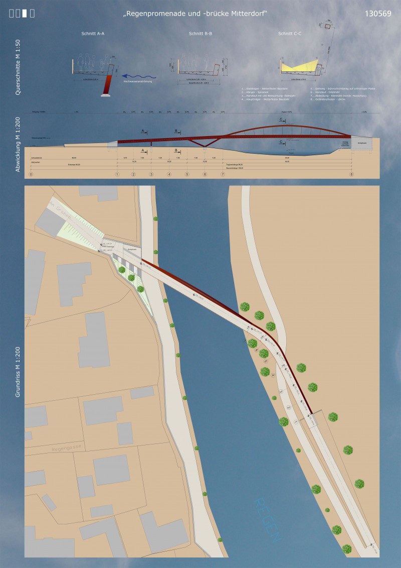 Der Steg überspannt den Regen mit sanftem Schwung im Aufriss als auch im Grundriss. Durch die gekrümmte Wegeführung im Grundriss entsteht eine sich ständig verändernde Perspektive, deren Zentrum stets der Kirchturm von Roding ist.