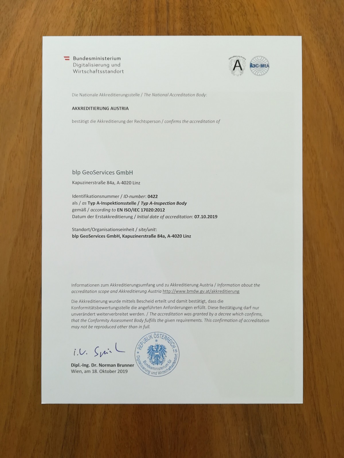 Seit 07.10.2019 sind wir Typ A-Inspektionsstelle gemäß ISO 17020:2012 für alle Untersuchungen gem. Anhang 4 Teil 2 1.2-1.7 Deponieverordnung 2008.