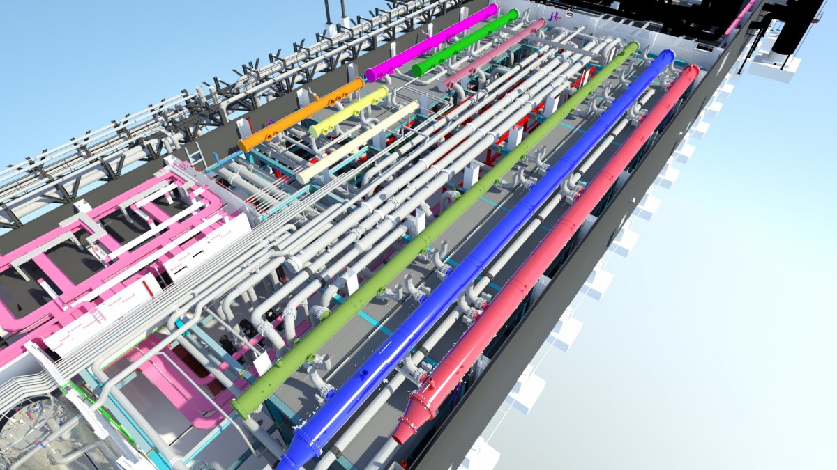 Schatz Engineering erhielt den Zuschlag für die Planung der Rohrstatik für die Kälteleitungen sowie die statische Dimensionierung, Innendruckauslegung und Erstellung der Fertigungszeichnungen der Headerleitungen. Um die Kühlwasserbecken der Kühltürme als kommunizierende Röhren zu verbinden, wurden die Becken mit einer Balance Pipe verbunden. Die Becken haben 2 Abläufe DN400 aus hochfrequenzgeschweißten Stahlrohren. Diese Saug- und Druckrohre haben eine Länge von bis zu 50 m, einen Durchmesser von 1220 mm, Auslegungsdruck von 16 bar mit einer Wandstärke bis 20 mm und Lagerlasten bis zu 150 kN. DI Matthias Staffenberger als Statiker und Ing. Siegfried Schachinger mit seinem Team übernahmen die Berechnung und Planung des äußerst interessanten Projektes. Dank des ausgeprägten Know-hows der Kollegen wurden in bisher fast 700 Arbeitsstunden die Berechnung, Modellierung und Zeichnungserstellung unter Berücksichtigung von sämtlichen Normen und Standards durchgeführt. Das Projekt wurde in bewährter Weise mit Rohr2 berechnet und das 3D Modell mit Autodesk Inventor erstellt.
