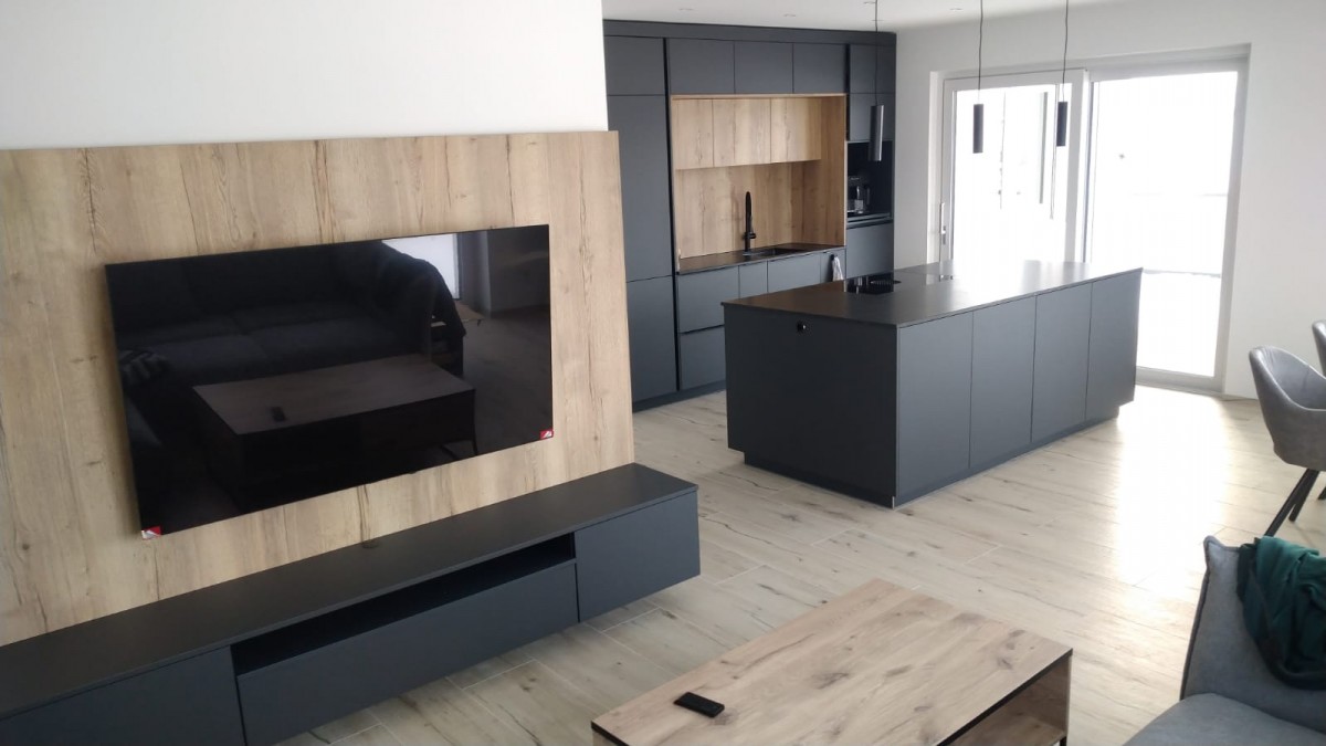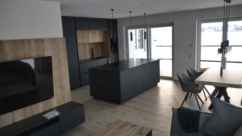 Hier entstand eine Penthousewohnung mit der Kombination Eiche und Schwarz - Großformatige Fliesen welche hier täuschend echt wirken und der echten Eiche um nichts nachstehen.
