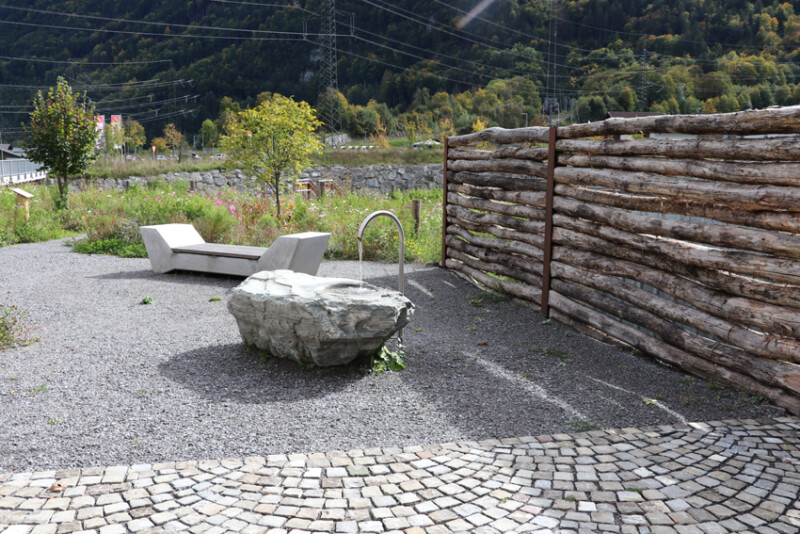 Die Sitzgelegenheiten greifen gestalterisch Elemente der Lawinenverbauung auf. Ein stilvoller Brunnen lädt zum Verweilen ein. Die Gestaltung der Außenflächen fügt sich harmonisch in die umgebende Landschaft ein: Naturstein, Holz und regionale Vegetation betonen den Bezug zur alpinen Umwelt und schaffen eine angenehme Atmosphäre, die zum Entdecken, Verstehen und Verweilen einlädt.