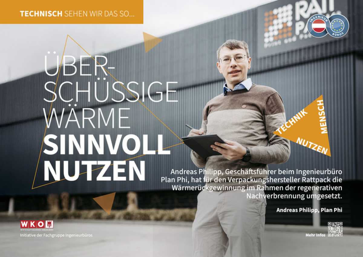 Für den Verpackungshersteller Rattpack mit Sitz in Wolfurt hat Andreas Philipp, Geschäftsführer des Ingenieurbüros Plan Phi in Dornbirn, die technische Planung für das Projekt "Wärmerückgewinnung" im Rahmen der regenerativen Nachverbrennung umgesetzt. In diesem Prozess fallen bis zu 800 Kilowatt Abwärme bei Temperaturen von 200 Grad Celsius an.
