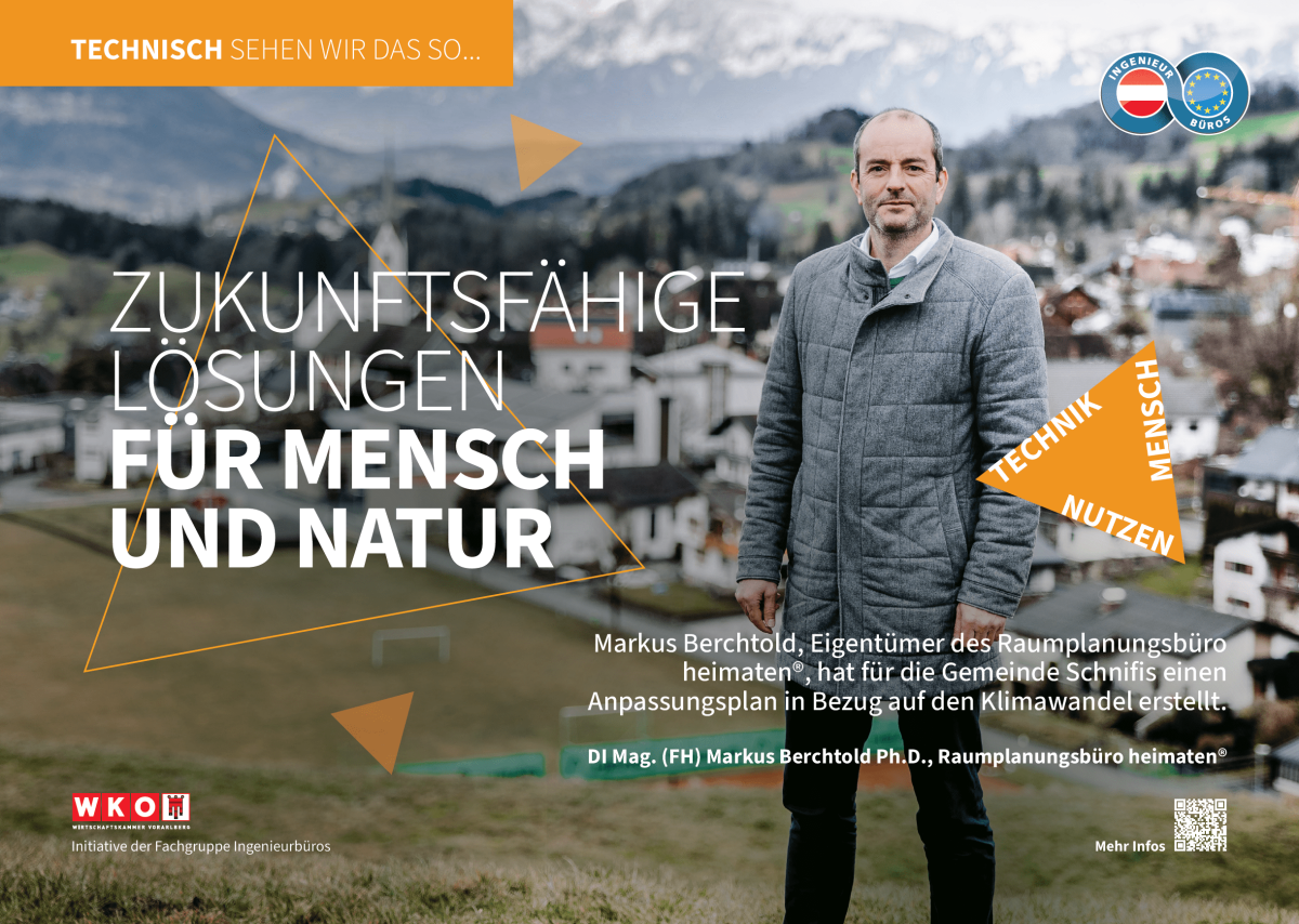 Seit fast 20 Jahren betreut er die Gemeinde Schnifis in ihrer Entwicklung. Die Aufgaben sind vielfältig: Es geht um die Verbindung von Einzelinteressen mit dem Gemeinwohl sowie effiziente und nachhaltige Siedlungsstrukturen, ein schönes Orts- und Landschaftsbild und vor allem um eine hohe Lebensqualität für die Menschen. Derzeit erstellt das Ingenieurbüro heimaten® einen Katastrophenschutzplan und einen Klimawandel-Anpassungsplan für die Gemeinde. Dabei ist es selbstverständlich, den aktuellen Stand der Wissenschaft und der rechtlichen Rahmenbedingungen für zukunftsfähige Lösungen einzubringen.