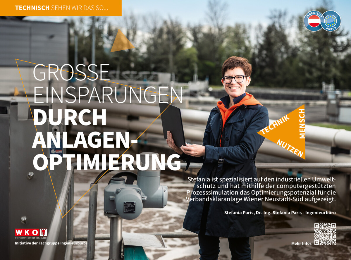 Die Imagekampagne der Ingenieurbüros Vorarlberg stellt Ingenieur*innen und ihre Arbeit in den Mittelpunkt. Am Beispiel der Simulation zur ARA Wiener Neustadt-Süd zeigt Ingenieurin Stefania Paris, wie technische Planung zur betrieblichen und energetischen Optimierung von Kläranlagen beitragen kann.