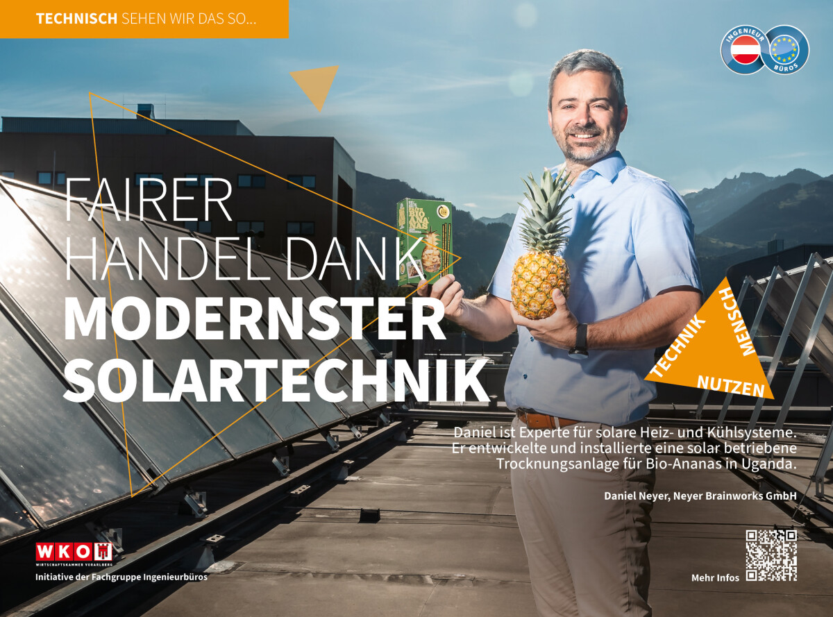 Die Imagekampagne der Ingenieurbüros Vorarlberg rückt Ingenieur*innen wie Daniel Neyer in den Fokus, der mit der solar-autarken Ananas-Trocknungsanlage in Uganda zeigt, wie technische Innovation nachhaltige Wertschöpfung und internationale Zusammenarbeit ermöglicht.
