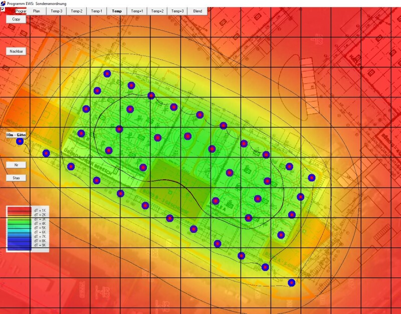 Die Gebäudesimulation zeigte bereits sehr früh ein hohes Einsparpotential bei der erforderlichen Wärmepumpenanlage. Ausgehend von einer ermittelten Heizleistung von 500 kW konnte eine Reduktion auf 310 kW erzielt werden. Das erforderliche Sondenfeld wurde mittels Bohrfeldsimulation (durch Fa. EnerGreen) dahingehend optimiert, dass eine ideale Sondenanordnung zur bestmöglichen Wärme- und Kältenutzung erreicht wurde.