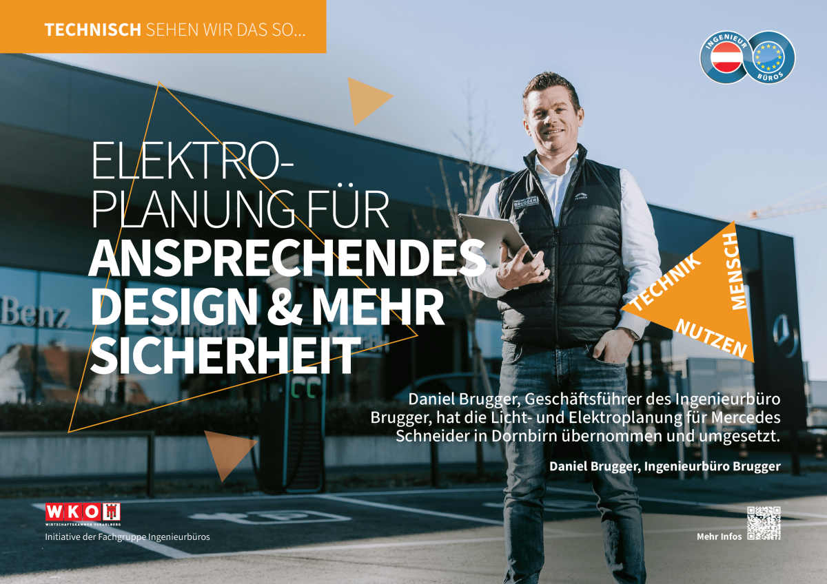 Das Autohaus Mercedes Schneider in Dornbirn ist vielen ein Begriff und bereits "beim Vorbeifahren" ein echter Blickfang. Daniel Brugger, Geschäftsführer des Ingenieurbüros Brugger GmbH in Thüringen, hat die Elektroplanung inklusive Überwachung mit Beleuchtung sowie Medien- und Sicherheitstechnik umgesetzt.