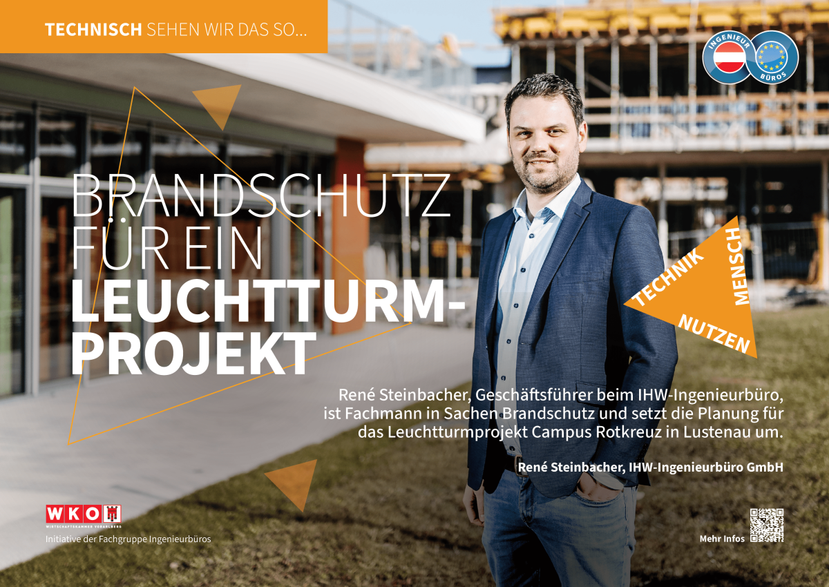 In Lustenau entsteht mit dem Campus Rotkreuz ein wahres Leuchtturmprojekt. Unter einem Dach werden Volksschule, Kindergarten, Sonderpädagogisches Zentrum und Elternberatung vereint. Das IHW-Ingenieurbüro rund um Geschäftsführer René Steinbacher hat den Auftrag für die gesamtheitliche Fachplanung in Sachen Brandschutz bekommen - von der Entwurfsphase bis zur Fertigstellung des Projekts.