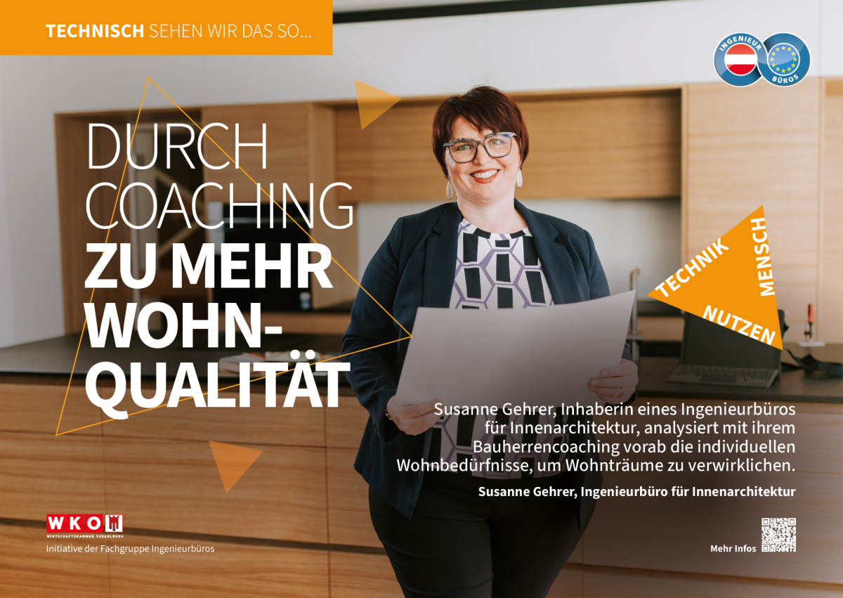 Die neue Imagekampagne der Vorarlberger Ingenieurbüros zeigt, wie vielfältig und praxisnah modernes technisches Know-how heute ist: Unabhängige Ingenieur*innen verbinden Mensch und Technik mit Kompetenz, Kreativität und einem klaren Blick für individuelle Lösungen. Wie das konkret aussehen kann, zeigt das Bauherrencoaching von Susanne Gehrer.