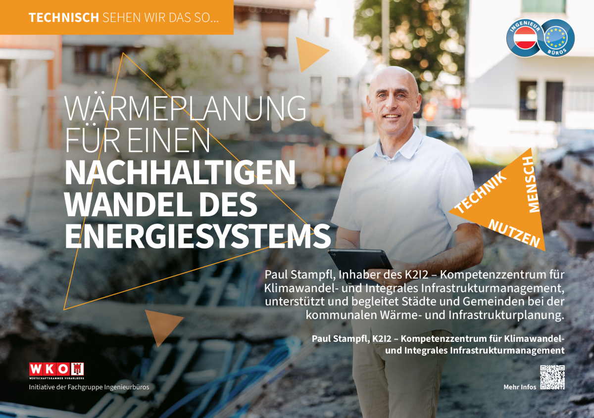 Die neue Imagekampagne der Vorarlberger Ingenieurbüros zeigt, wie vielseitig modernes technisches Know-how eingesetzt wird: Unabhängige Ingenieur*innen entwickeln Lösungen für zentrale Zukunftsfragen. Das K2I2 Kompetenzzentrum von Paul Stampfl steht dabei exemplarisch für professionelle kommunale Wärmeplanung und nachhaltiges Klimawandelmanagement.